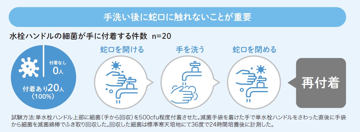 不特定多数の人が触れるハンドル式水栓には細菌などが付着している可能性があります。せっかくきれいに手洗いをしてもハンドルに触れることで、細菌やウイルスなどの汚れが、再び手指に付着する可能性があります。試験ではその割合は20人中20人という結果でした。手洗い後に水栓のハンドルに触れることは手洗いの効果をなくす可能性があることがわかります。