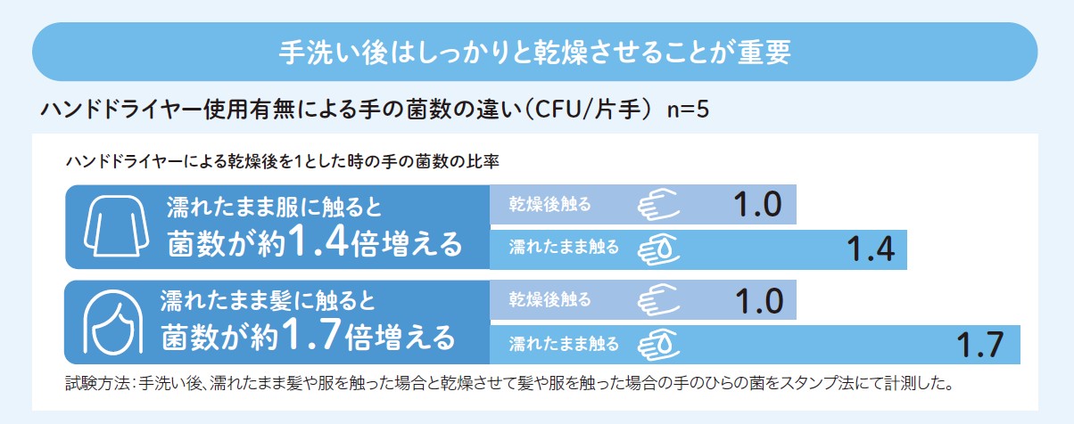 手洗いの後、濡れた手で髪を整えたり、ハンカチ代わりに服で手を拭いた経験は誰にでもあるもの。しかし髪や服には目に見えない汚れや細菌が付着している可能性があります。毛髪には1平方センチメートルあたり10⁵、頭皮には10⁴もの細菌が存在しているとの報告(※)があります。濡れた手で髪や服に触ればそこにある汚れや細菌の多くが手に付着してしまいます。試験では、手が濡れたままの状態だと、乾燥した場合と比較して、手の接触により移る菌数が多いことが確認できました。手洗い後はしっかりと乾燥まで行う習慣をつけることが重要です。