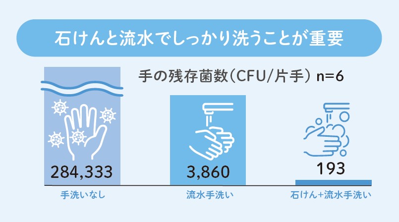 手を洗うときには石けんと十分な流水でしっかり洗うことが重要です。